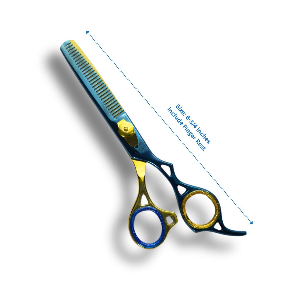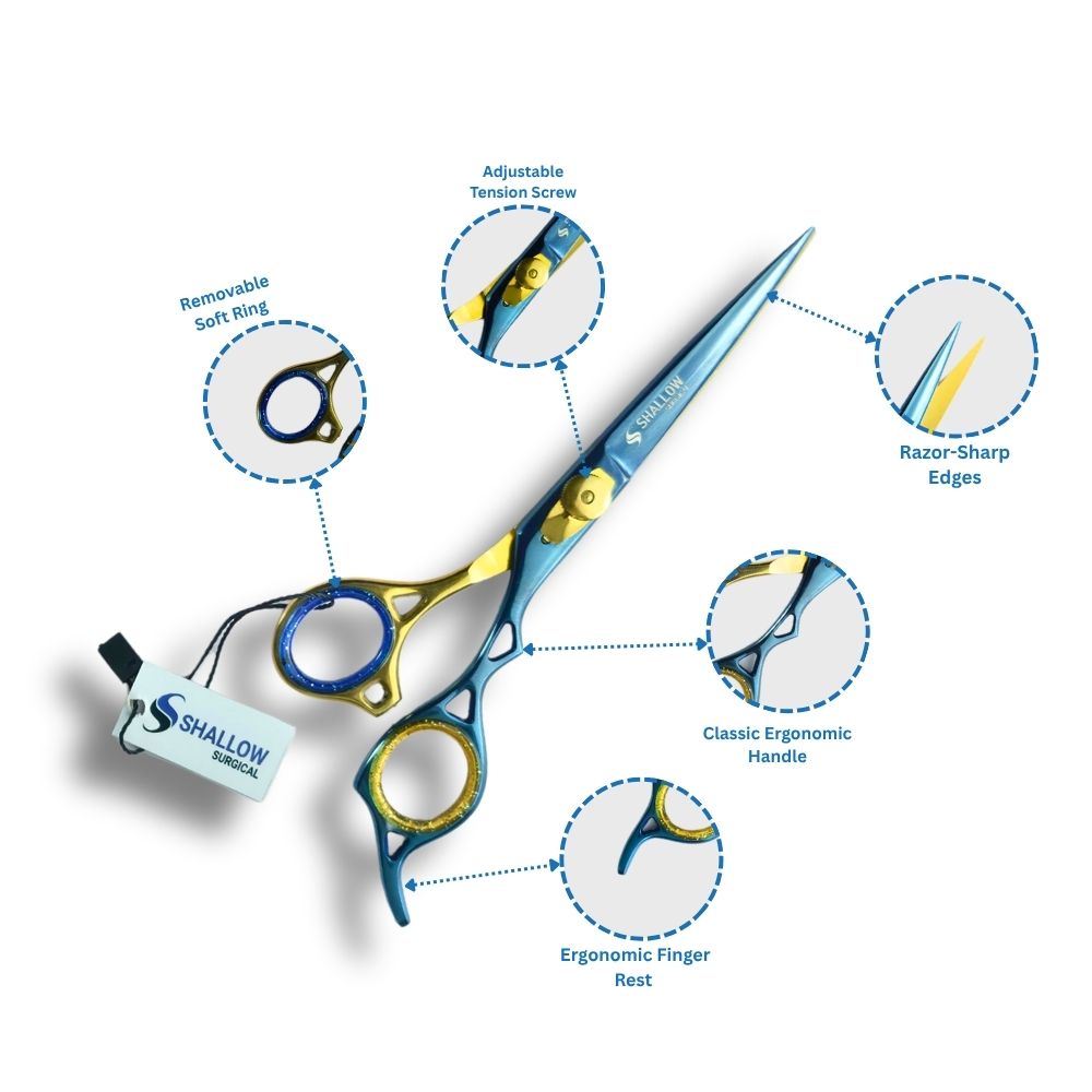 Tijeras con Diseño de Red: Mangos calados con acabado en azul y oro que ofrecen ligereza y un agarre antideslizante único.
