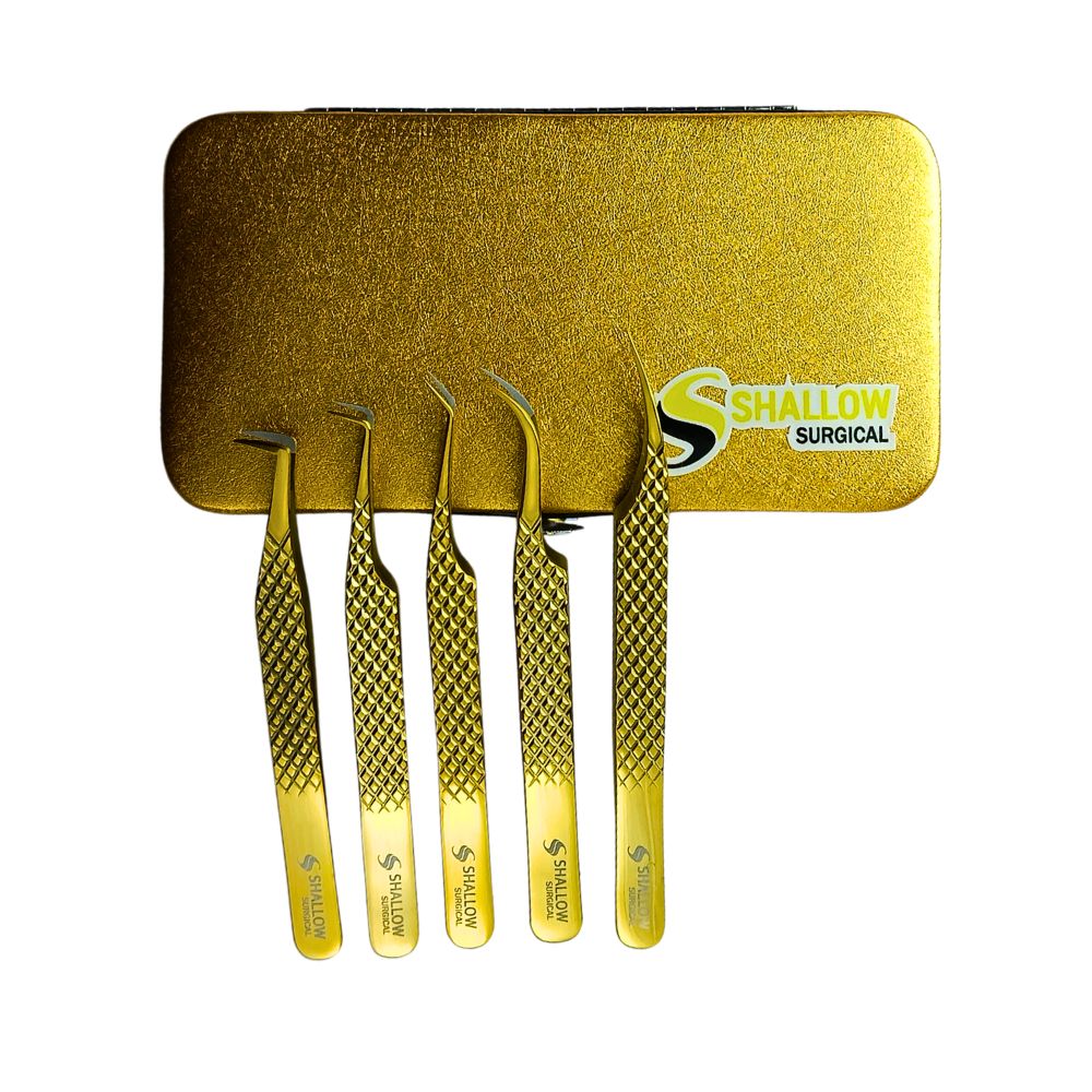 Nuestro set de pinzas Shallow Surgical en acabado dorado no solo destaca por su belleza, sino por su rendimiento superior. Con tecnología de Punta de Fibra, estas herramientas están diseñadas para ofrecer un agarre total, facilitando el trabajo de volumen ruso y mega volumen.
