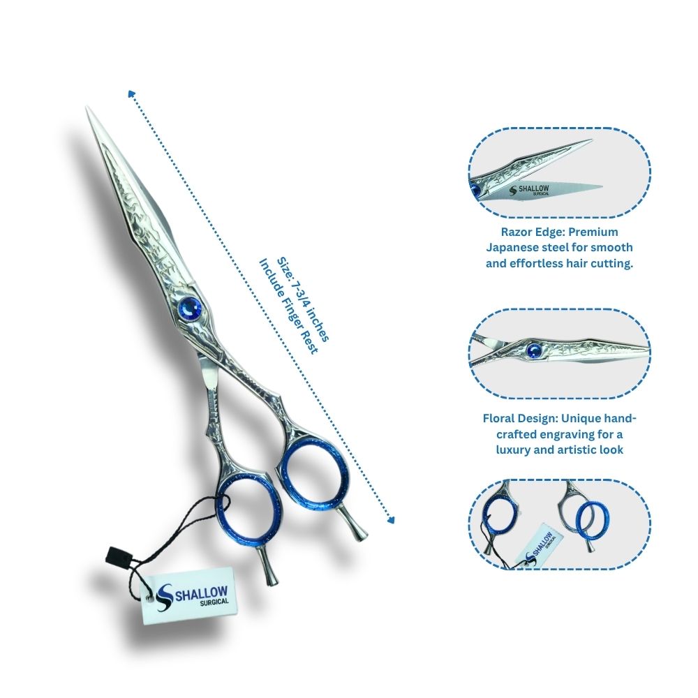 Descubre el equilibrio perfecto entre arte y funcionalidad con la tijera Zafiro Plateado de Shallow Surgical. Su exclusivo grabado estilo Damasco y el detalle del tornillo en azul zafiro la convierten en una herramienta de colección para los mejores salones de España.