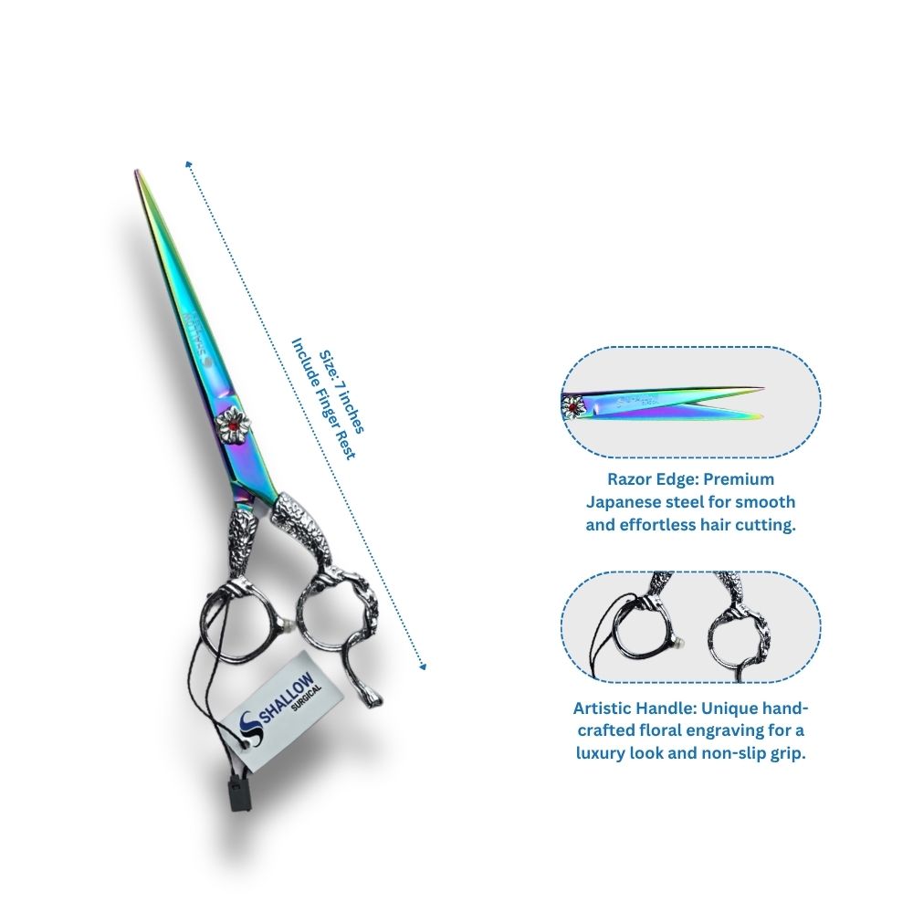 Descubre la tijera Aurora Antique de Shallow Surgical, una pieza donde el arte se une con la precisión quirúrgica. Con hojas en acabado tornasol multicolor y mangos de plata esculpidos con detalles barrocos, esta tijera es la herramienta definitiva para los estilistas que buscan destacar en España.