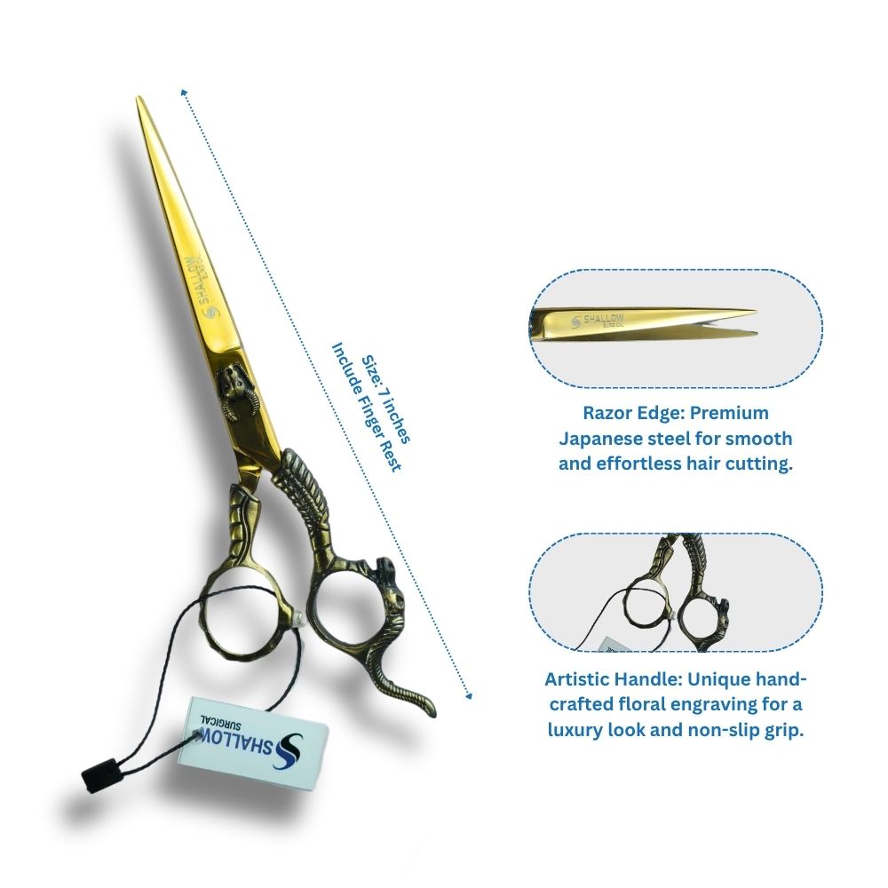 Eleva tu arte a un nivel épico con la tijera Guerrero de Oro de Shallow Surgical. Esta pieza maestra combina mangos esculpidos con motivos de dragones y un tornillo central en forma de cráneo, rematada con hojas doradas de alta precisión para el barbero que no teme destacar en España.
